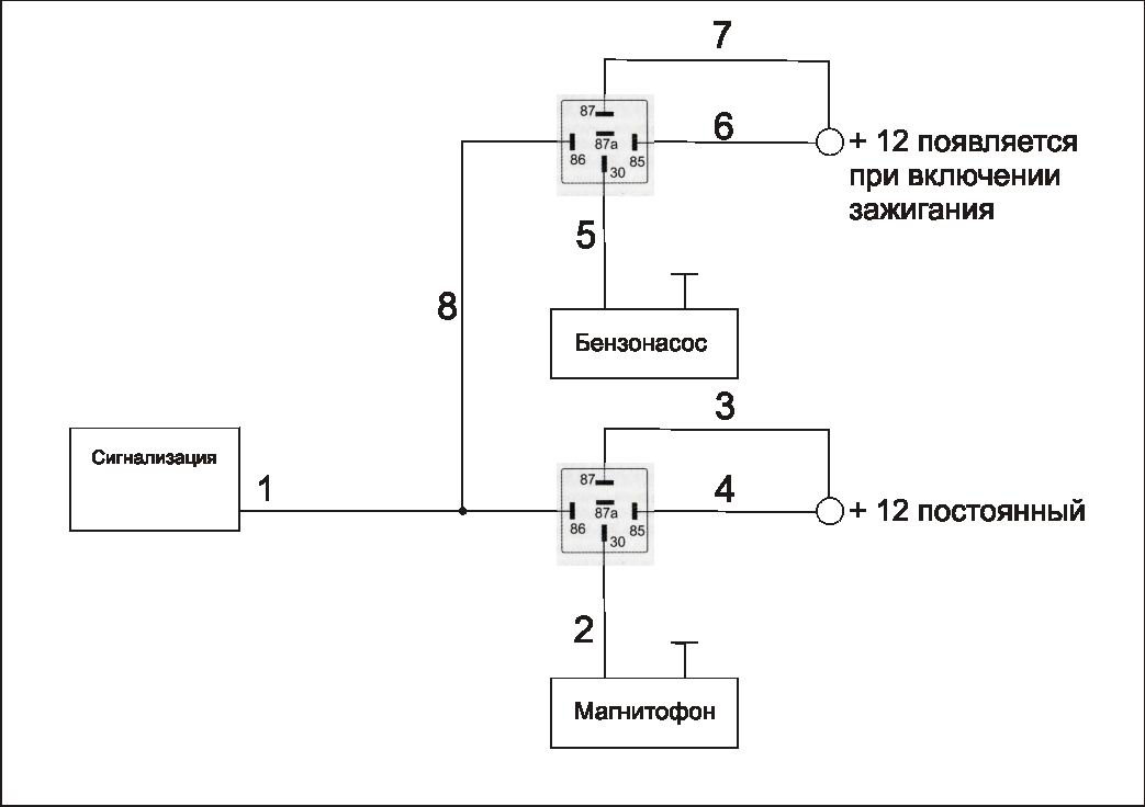 1) У меня подключен магнитофон к проводу сигнализации на котором появляется минус при снятии авто с охраны (провод 1), на этом же проводе висит реле блокировки бензонасоса.