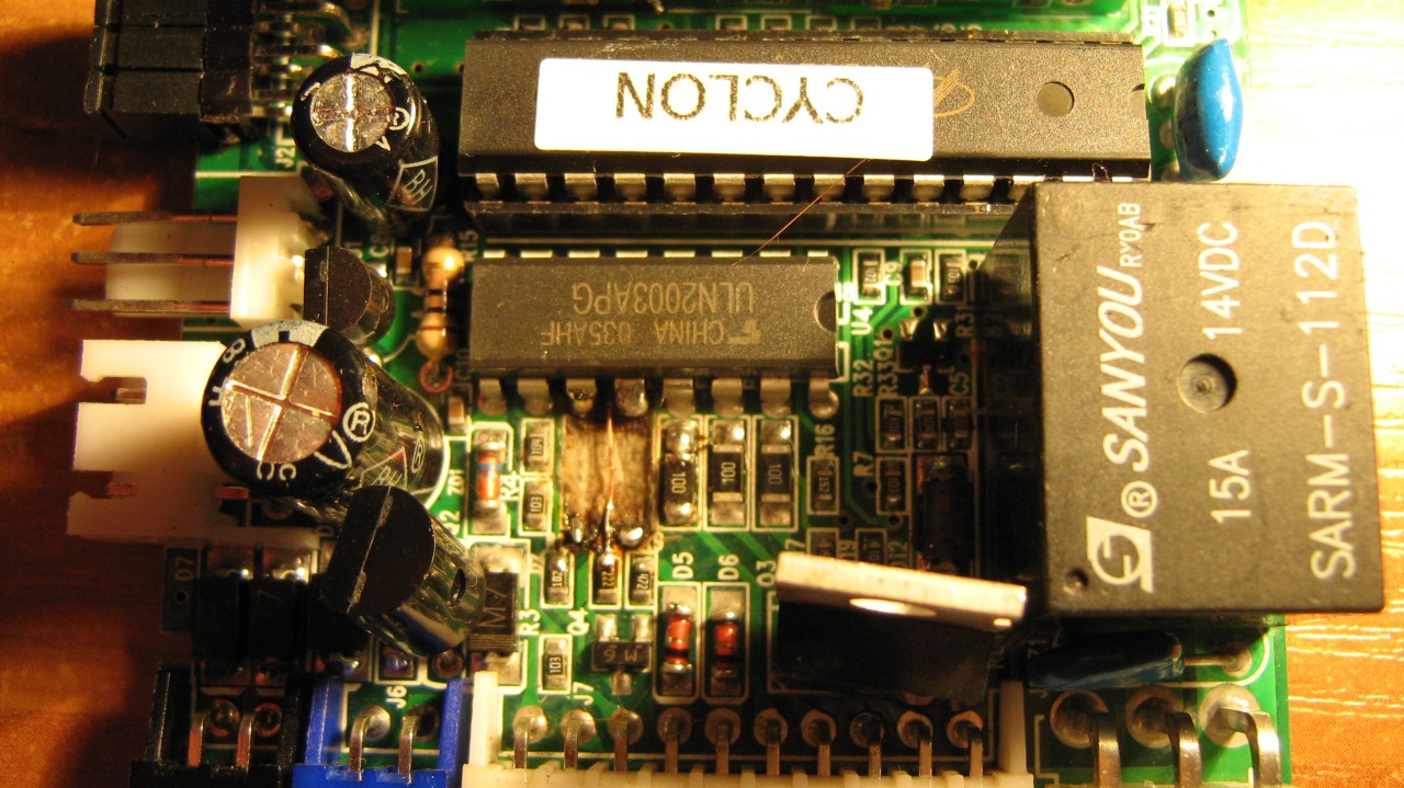 Реле сидит на 16-ой ножке, ( было 5,2 вольта,контакты то притягивало, то нет, на это я обращал внимание)ZD1 выпаял- проверил, исправный, . Впаял обратно, на 9-ой ножке 9.8 вольт. Выпаял микросхему ULN2003 , ещё не нашол её, базар выходной. Пока впаиваю понельку для неё. Поставлю- отпишесь.