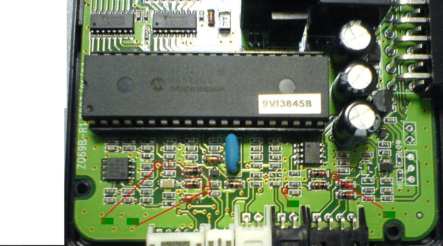 точки 1 и 2 это точки капота и багажника соответсвенно, после которых дорожки идут на 18-ти контактный разьем и напряжение на них: масса - в 1 точке и 7В относительно плюса в точке 2 (или же 5В относительно массы)