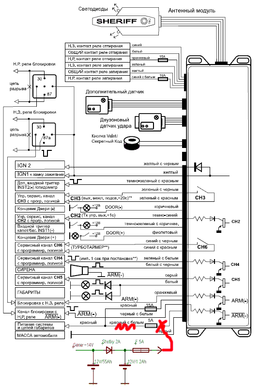 1.А у меня например сирена с двумя выводами! Как мне эту схему приспособить к Шерифу.