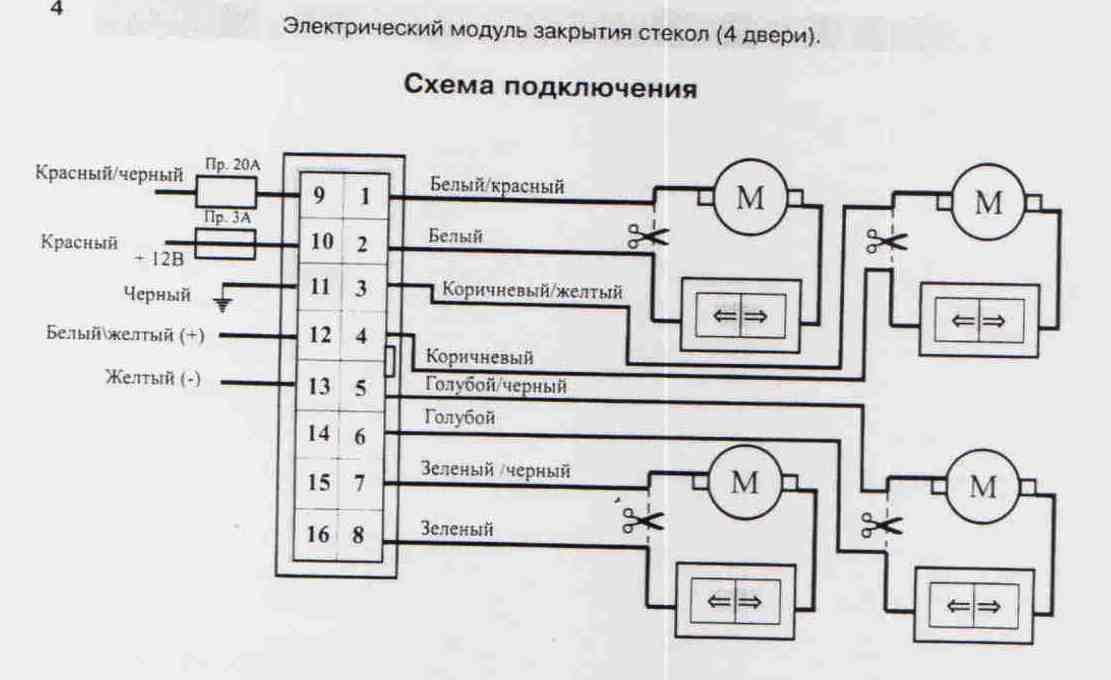 | У меня тоже эта гадость ( PWM - 4 ). Подключил как на схеме, но "запускающий вход" я взял с проводов которые идут на центральный замок (уже в двери). Логично подумал что импульс там появляется. Но такая система не работает. В описании к мангусту написано "НЕ использовать одновременно запускающий вход + и -" поэтому пробовал подключать их поочередно - ничего! Пожалуйста подскажите почему??? Куда подключить этот могуст чтобы он хоть стекла закрывал???