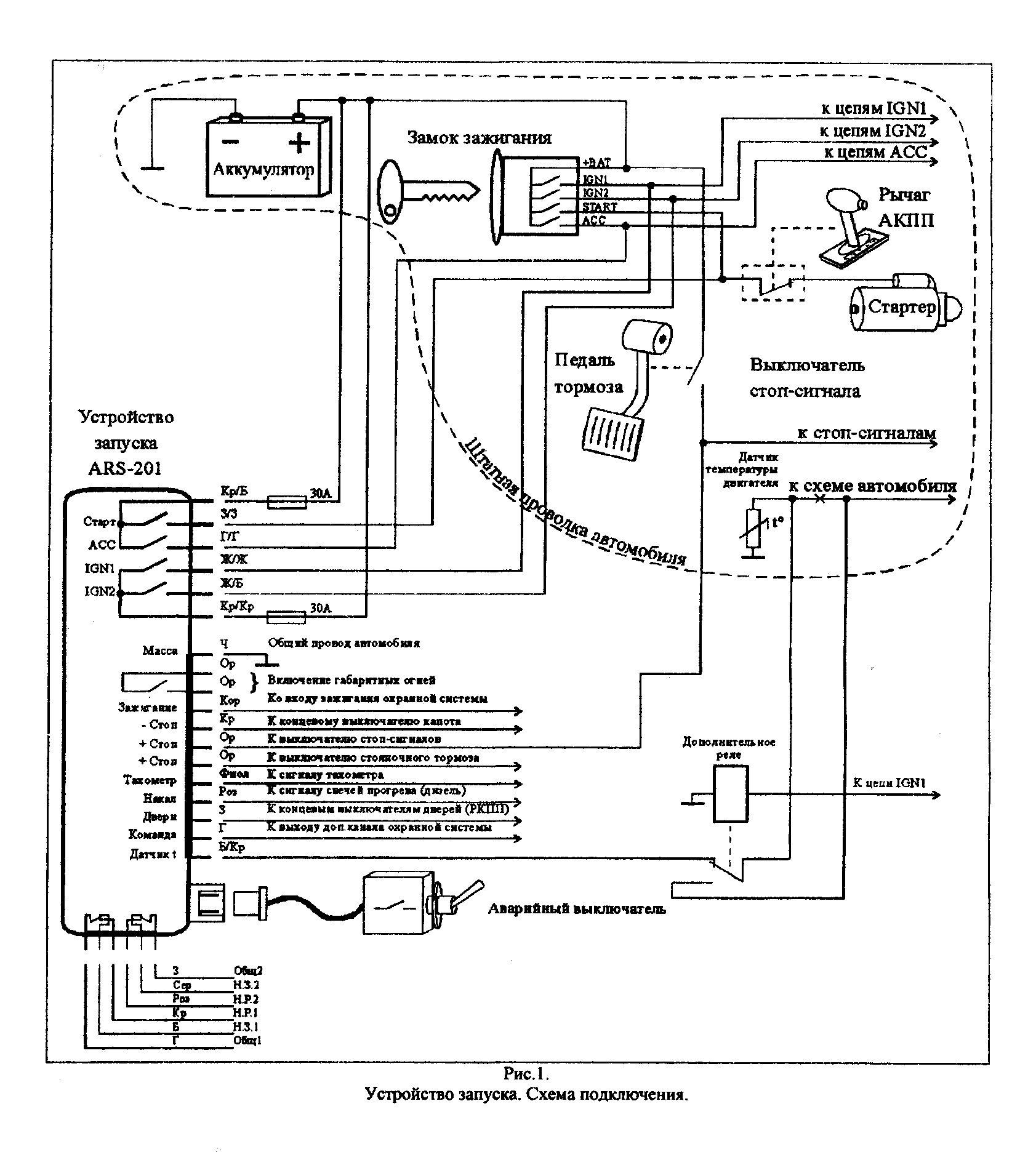 Вот что скачал из инета:Некоторые особенности подключения..." Силовой жгут с готовыми предохранителями в цепях питания (30 А) и ¦габаритов¦ (10 А) подключается к устройству при помощи одиночных контактов. Отметим, что дополнительный силовой выход, обозначенный на схеме как АСС, на самом деле программируется функцией 6 служебного раздела как ¦питание аксессуаров¦ (по умолчанию) либо как ¦третья цепь¦ зажигания, необходимая на некоторых современных автомобилях. В режиме АСС выход включается через 30 секунд, в режиме IGN3 = через 4 секунды после подачи ¦основного¦ зажигания. Выход включения стартера подключается к соответствующему проводу замка зажигания до разрыва цепи выключателем"....