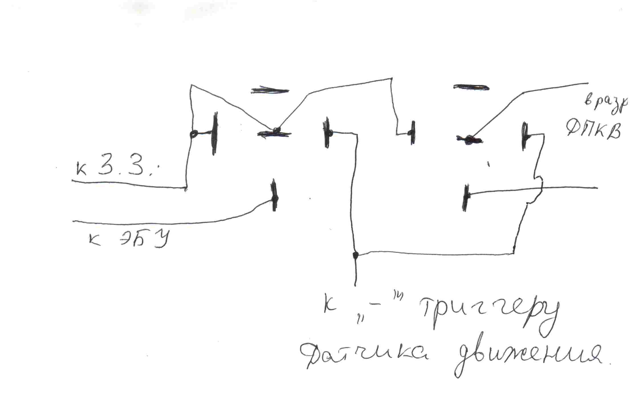 надеюсь последняя схемка Если я правильно понял кнопку вкл/выкл. этои системы подключать к датчику движения, т.е. включая питание на датчик он будет разрывать цепи при движении.