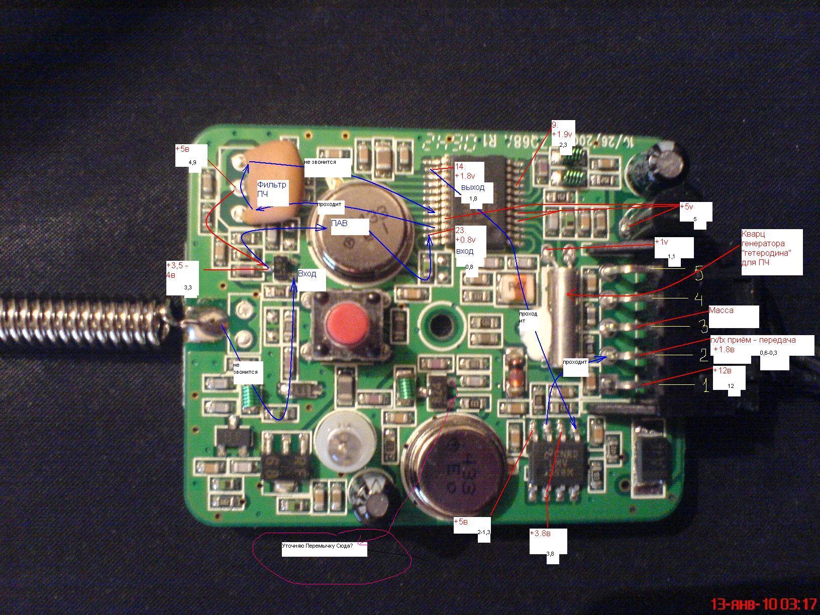 Хорошо, давайте на время заблокируем передатчик(обратную связь) поставим перемычку база-эмиттер транзистора Q1[R24](нижние два со стороны разъёма). Далее тестером на 14 выв UAA3220 или 5 выв LMV358 наблюдаем зависимость "шевеления" напряжения от нажатия кнопки брелока, немного, гдето +- 0,5в., на разном расстоянии.