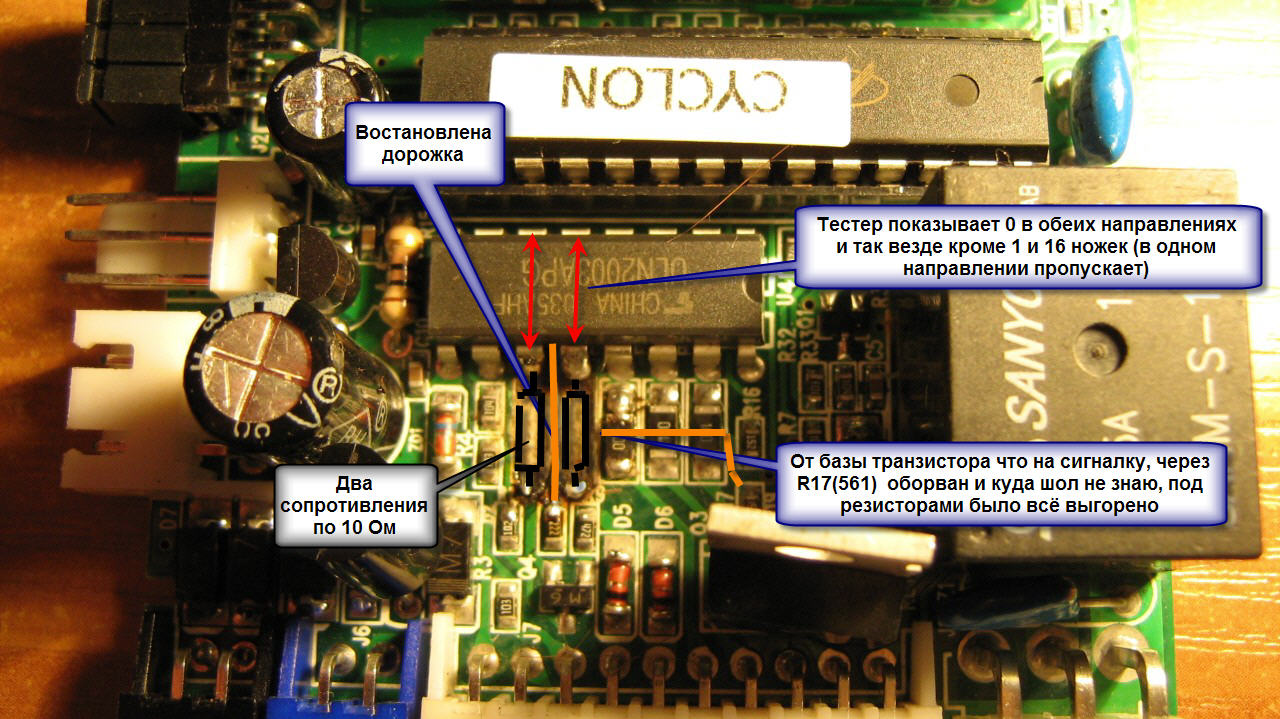Да, с оммами махонл, с SMD элементами на работал.Впаивал 100 Ом но и 10 Ом кажется не решит проблемы. Что выяснил, отобразил на фото. Транзистор на сирену исправный. Реле контакты цокают слышно.Может у кого есть такая сига, посмотреть куда идёт эта дорожка!!!