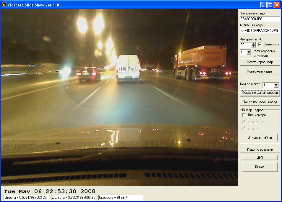 Для начала образцы кадров СВК-003 (640х480) при дневном освещении в солнечную погоду.(изображения видны в теме только залогиненым посетителям!) В каждом файле есть информация по скорости и точным координатам GPS. Время забыл проставить, поэтому там 2000 год красуется . Скорость записи 5 кадров в секунду, подключена 1 камера.